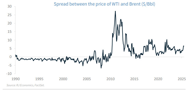 Gasoline prices are shaped by global market forces, not short‑term policy actions. What really matters is what happens during geopolitical crises that disrupt oil supplies. In those moments, the usual relationship between oil prices and gasoline prices breaks down. Historically, US gasoline prices move closely with oil prices, whether measured by the US benchmark (WTI) or the global benchmark (Brent). But during periods of global stress – such as the early 2010s – that relationship weakened sharply. At that time, the price gap between US and global oil surged, and gasoline prices followed global oil prices much more closely than US benchmarks. A similar pattern appears to be emerging today.